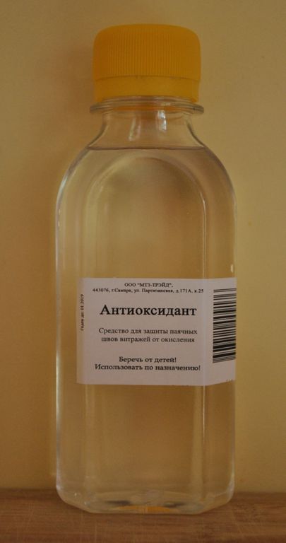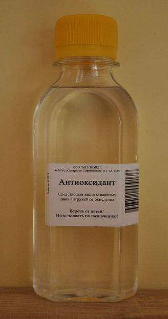 Антиоксидант - бесцветная маслянистая жидкость, которая наносится как финишное покрытие на паячные швы витража, препятствует их окислению и придает им блеск. Объем 150 мл.