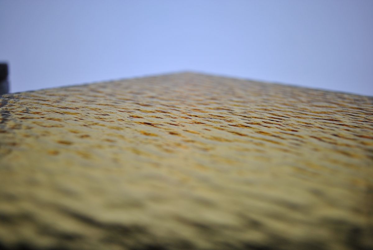 Другой важный параметр – фактура или рельеф, создаваемые на одной из сторон листа, для большей выразительности, подчеркивания некоторых моментов композиции, создания акцентов в работе. Могут представлять собой волны, рябь, имитацию чеканки, мятую кожу, тонкие параллельные полосы, мелкие бугорки, извилины и даже напоминать необработанный гранит. Например: