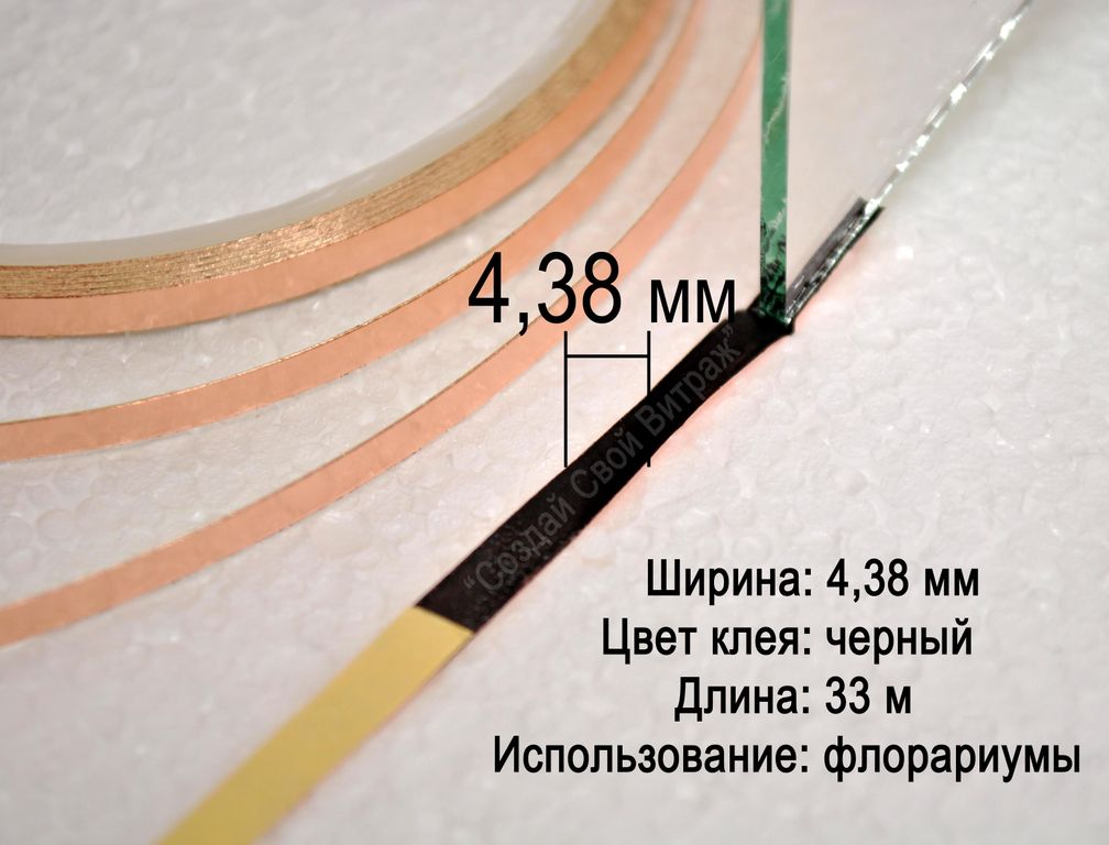 Самоклеящаяся медная фольга для витражей и флорариумов, шириной 4,38 мм, с черным клеящим слоем, в рулоне 33 метра. Используется для оклейки деталей флорариумов из стекла 2 мм. Хорошо приклеивается, позволяет получить аккуратный шов у изделия.