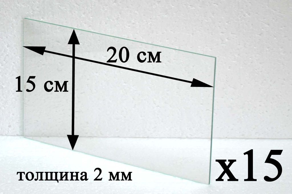 Комплект из 15 шт. стекла толщиной 2 мм; нарезано в размер 15х20 см (150х200 мм). Погрешность в размере: +/- 2 мм.