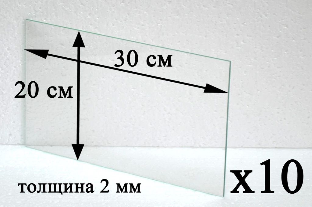 Комплект из 10 шт. стекла толщиной 2 мм; нарезано в размер 30х20 см (300х200 мм). Погрешность в размере: +/- 2 мм.